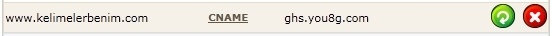 Önce Domainimizin kontrol paneline girip, 74.125.93.121 olan A kaydını siliyoruz. Ve onun yerine bir CNAME kaydı oluşturup subdomain olarak www verip ghs.you8g.com değeriyle eşleştirerek kaydediyoruz.