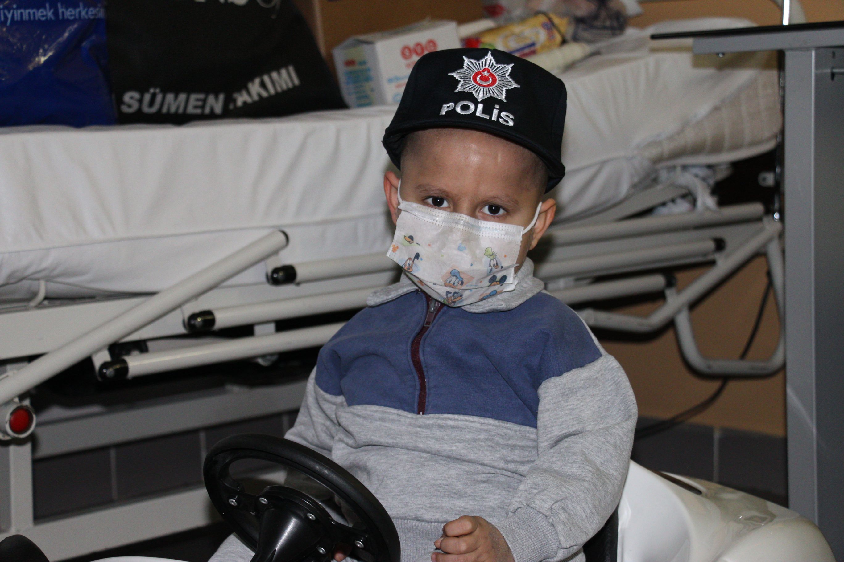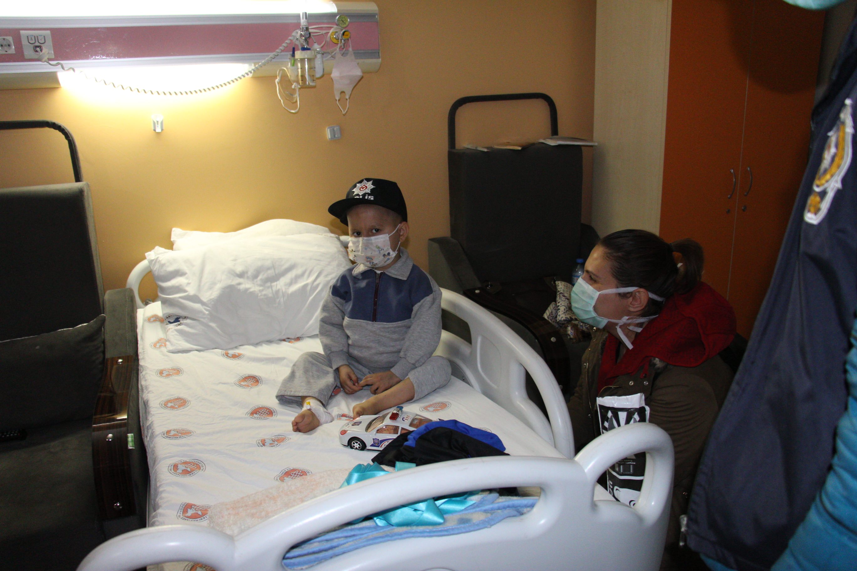 Tam olarak hayallerimde canlandırdığım gibi karşılayamadı bizi Mahir. Utangaç, ürkek ve suskundu. Sadece oturduğu yataktan bize bakıyordu. Güldürmeye çalıştıysak da nafile. Başarılı olamadık. Başına takılan polis şapkasından hiç rahatsız olmadı ve onu hiç çıkarmadı. Polis abileri ve ablaları da onu çok sevdi. Yanına oturdum ve Mahir’le bir fotoğraf çektirmek istedim. O ana kadar hiç konuşmayan ve yabancılık çeken Mahir, nedendir bilinmez, annesinin bir sözüyle “Like” işareti yaptı başparmağıyla. Ben de ona eşlik ettim ve odası nispeten karanlık da olsa bu değerli fotoğraf ortaya çıktı.