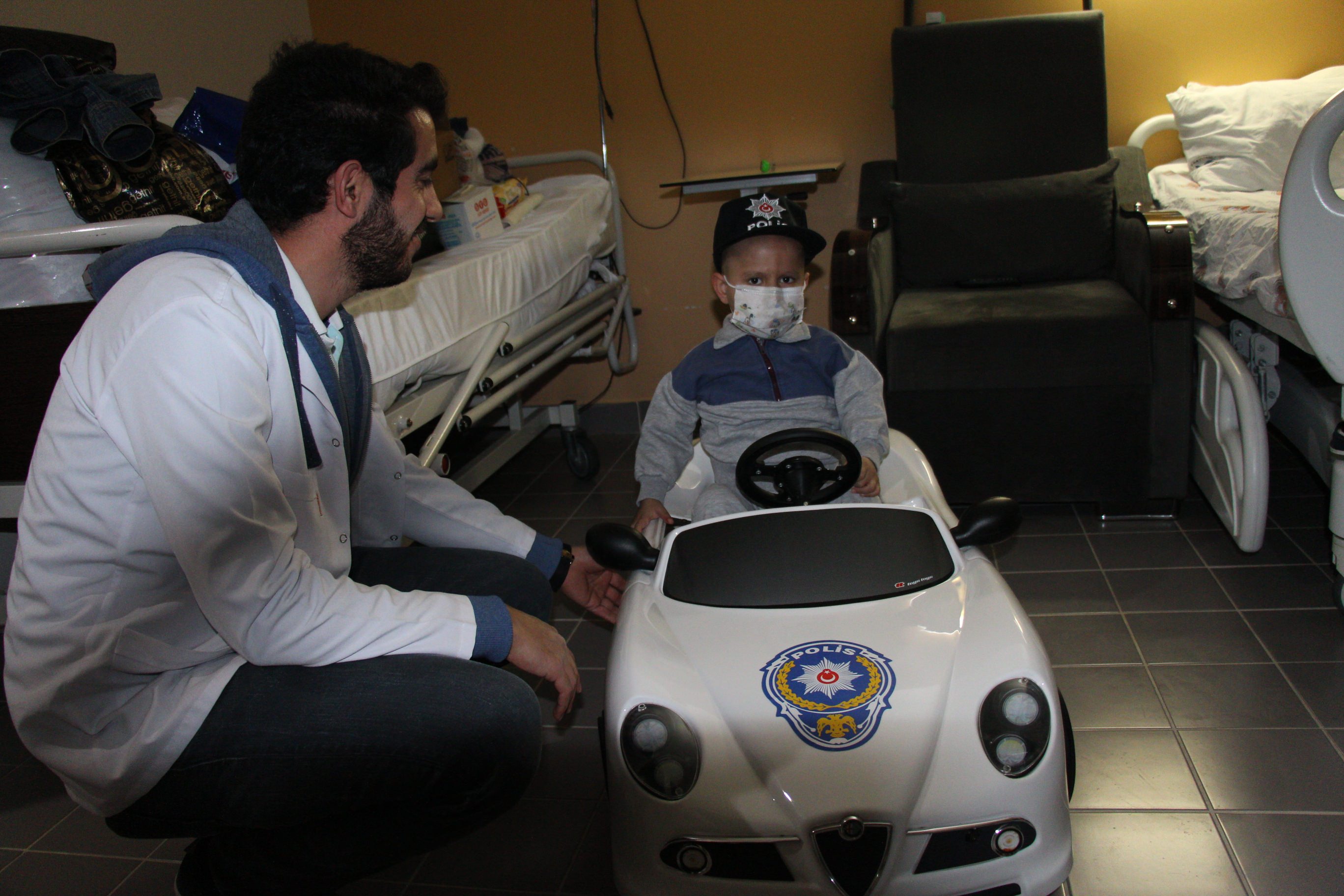 Madem Mahir polis olmak istiyordu, beyaz akülü araba hayaline kendimizden güzel bir şeyler katabilirdik. Ertesi gün hemen bir reklamcıya gidip bana polis logosu sticker’ı lazım dedim. Mahir’in arabasını gösterip hikayeden bahsettim. Kendisi bir kaputa, iki kapıya güzel stickerlar basıp, Mahir’e hediyem olsun dedi. Eve gelip hemen stickerları güzelce kestim ve arabaya yapıştırdım. Harika olmuştu. Peki Mahir’i gerçek polisler ziyaret etse nasıl olurdu? Aynı şehirdeki polis arkadaşlarımı arayıp Mahir’i ziyarete beraber gidip gidemeyeceğimizi sordum ve olumlu cevaplar aldım. Bir polis şapkası, polis tişörtü, oyuncak bir polis arabası, bir polis uçurtması ve hayalindeki o beyaz araba, güzel çocuk Mahir’e kavuşmak için dakikaları sayıyordu. Cuma akşamı geldi çattı. Kocaman arabayı kucakladığım gibi merdivenlerden indirdim ve mahallenin meraklı çocuklarının bakışları arasında arabanın bagajına yerleştirdim. Bilerek hızlıca geçtim yanlarından ki görüp özenmesinler çünkü özenilmeyecek gibi değildi. (Çocukken böyle bir arabaya sahip olmayı çok isterdim.) Arkadaşlarımla birlikte yola koyulduk.